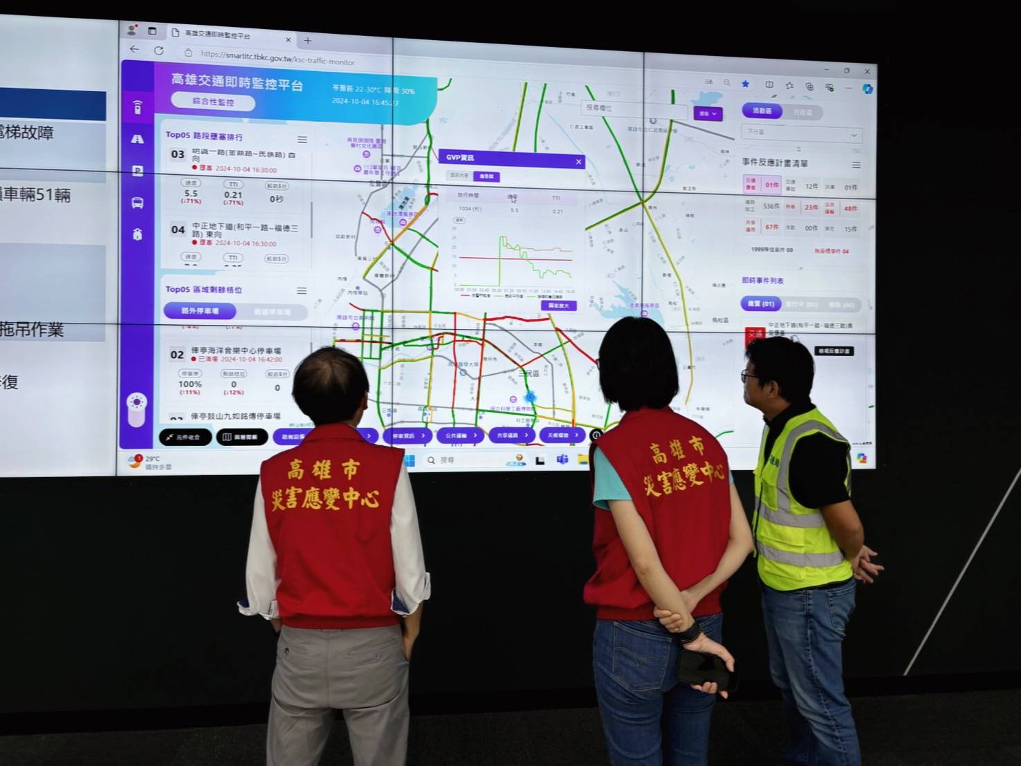 【記者林韋呈/高雄報導】山陀兒颱風因為破紀錄強風與部分區域超過凱米紀錄的豪雨,造成交通號誌桿件或號誌損壞,10月3日風雨漸歇後市府交通局隨即啟動維修及設備巡查工作,林副市長今於10月4日下午視察交通局智慧運輸中心,期勉交通局與相關協力廠商合作,加派工班儘速完成號誌搶修。