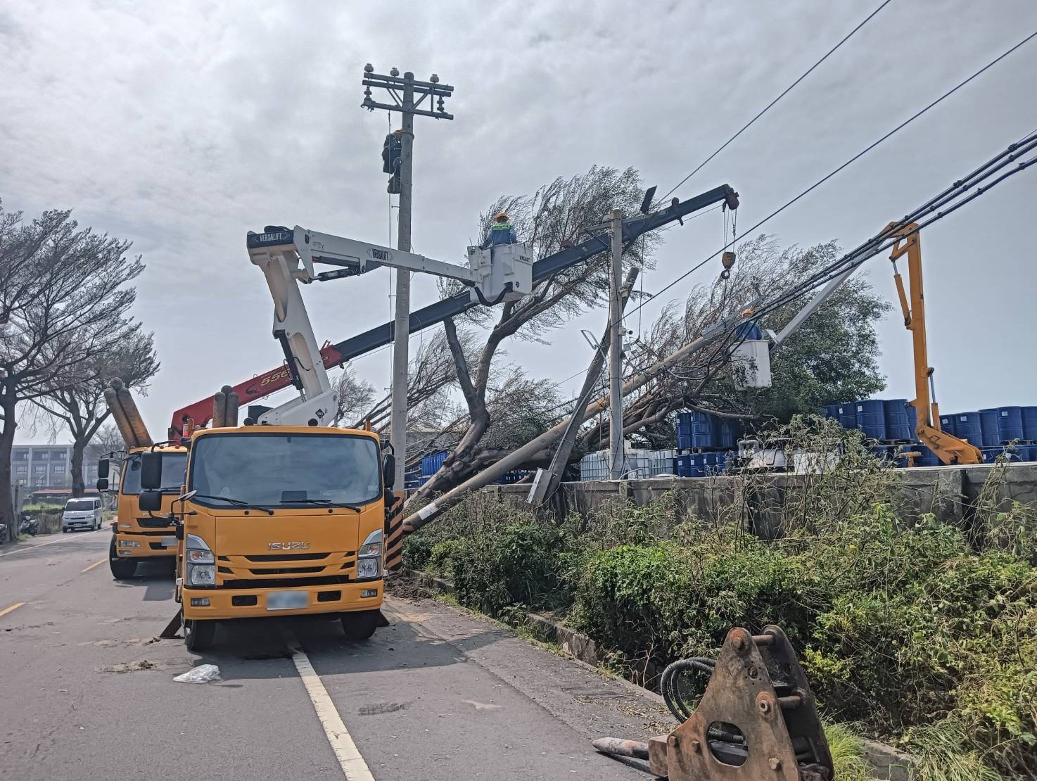 台電指出,台電自3日起陸續動員北中南15個區處人力前往高屏支援,今(5)日再增派37工作班前往高雄林園、大寮、仁武等電桿倒斷重災區支援,總計動員57班共316名人員,全力支援高雄地區搶修。截至今(5)日15時,高屏地區曾停電戶數達307,129戶,經台電同仁全力搶修後已復電九成五,並致力於今(5)日全數復電。