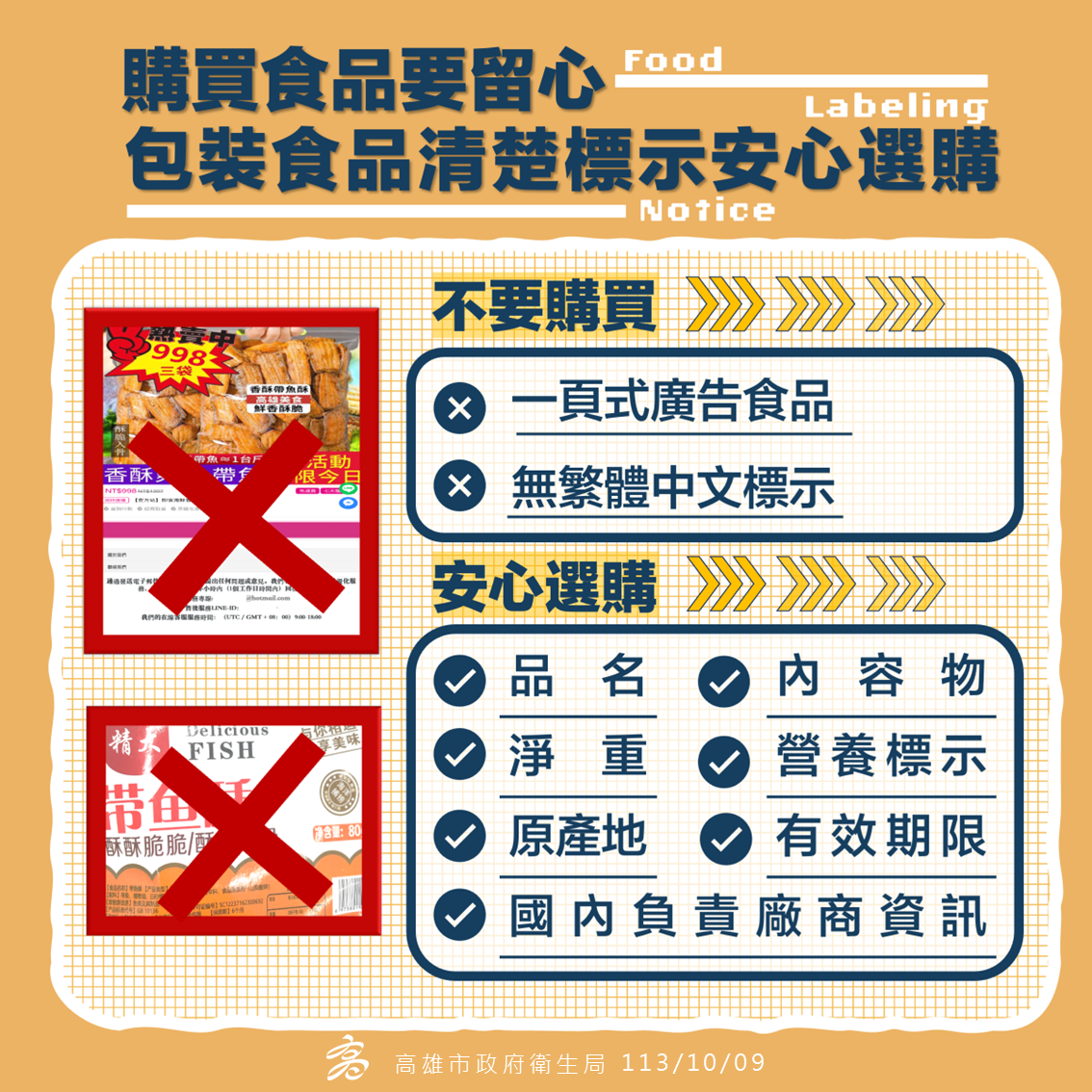 購買食品要留心,包裝食品清楚標示,安心選購。(高雄市政府衛生局提供)