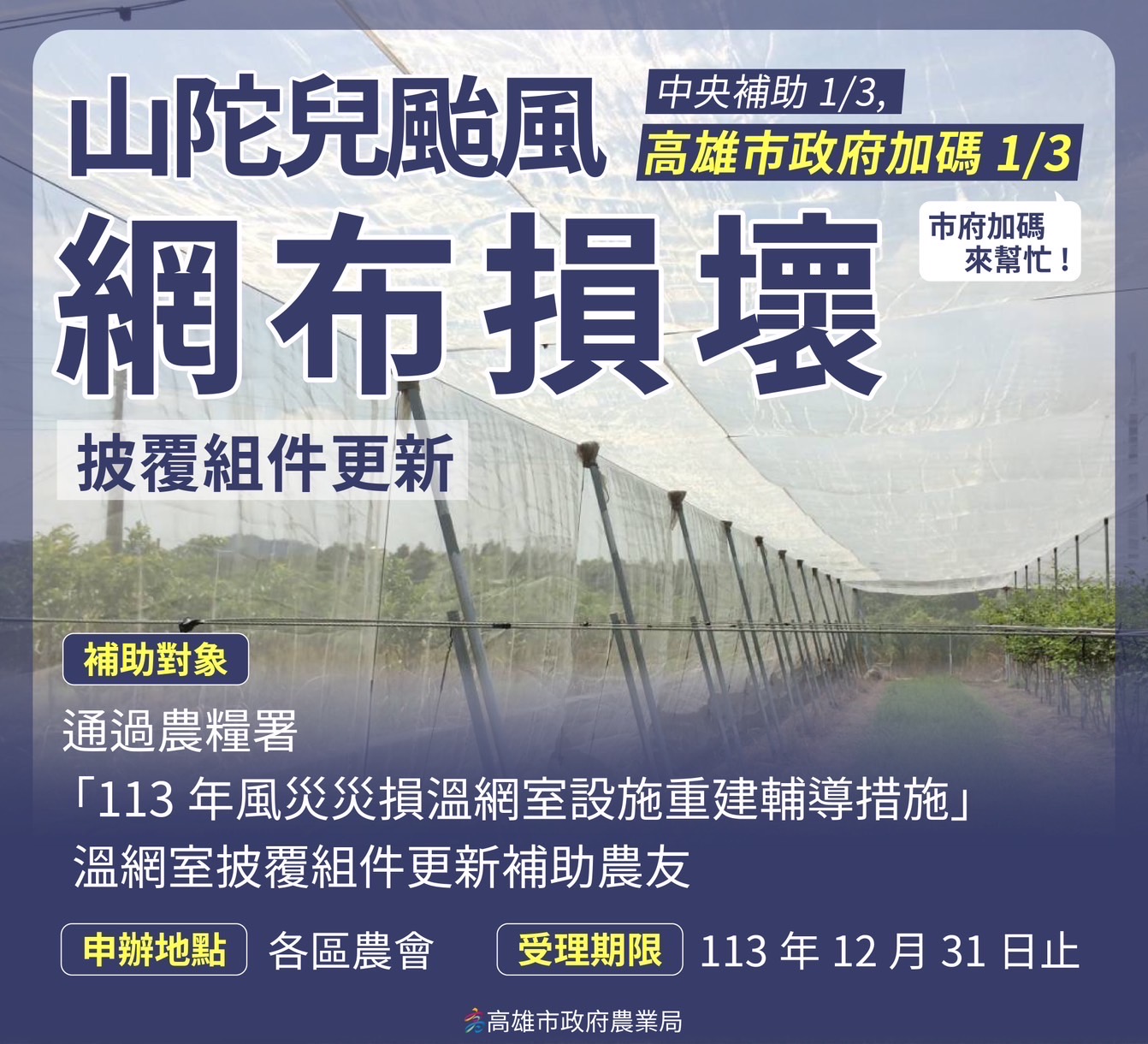 並鑒於本次強風導致農友溫網室設備損害嚴重,為減輕農民負擔,市府配合農糧署113年風災災損溫網室設施重建輔導措施,加碼網布及披覆組件補助,由農糧署補助1/3,本府加碼補助1/3。