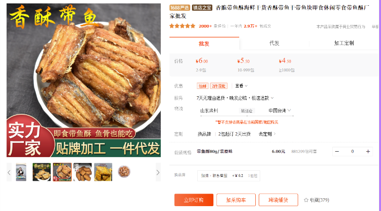 張博洋進一步說,該款帶魚酥產品為貼牌加工品,同規格的產品在中國僅販售人民幣4.5元(折合台幣20元),走私進口來台後利用「高雄海產」、「高雄美食」的名義,一包以16倍的價格販售。另外,帶魚酥包廠商的寄件廠商,更是常見的詐騙包裹廠商。不僅消費者權益受損,食安更是一大疑慮。