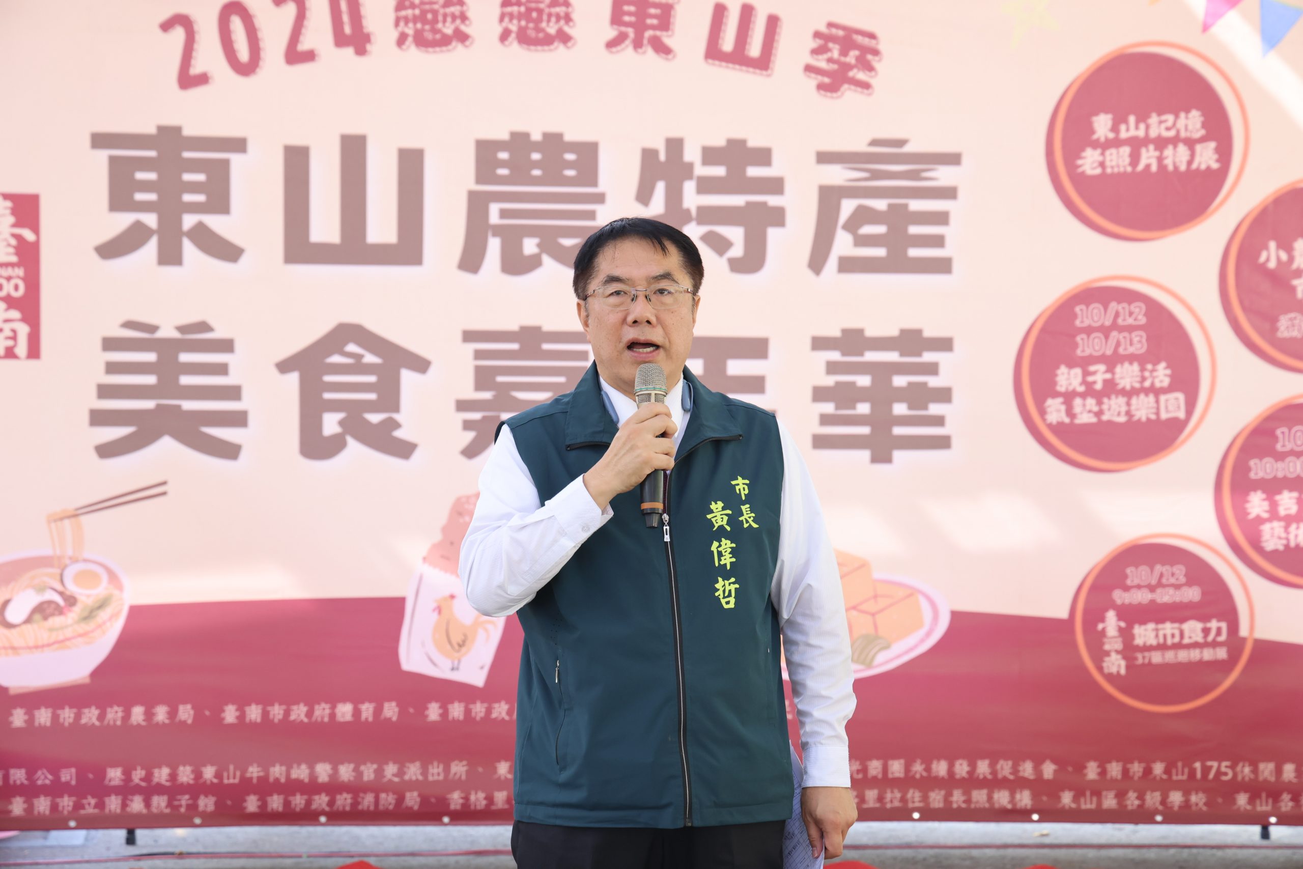 「2024戀戀東山季-山農特產美食嘉年華」今(12)日於東山區運動公園展開,為期兩天的活動十分精彩,包括美食饗宴、小農市集、氣墊樂園及運動競賽等,吸引許多大小朋友前來遊玩、消費。台南市長黃偉哲一早親臨會場,大推東山農產與創意料理,黃偉哲表示,東山咖啡香醇、龍眼果肉飽滿,單吃和入菜都十分美味,歡迎全國朋友把握時間相聚東山,欣賞美景也享受美食,大飽眼福和口福。