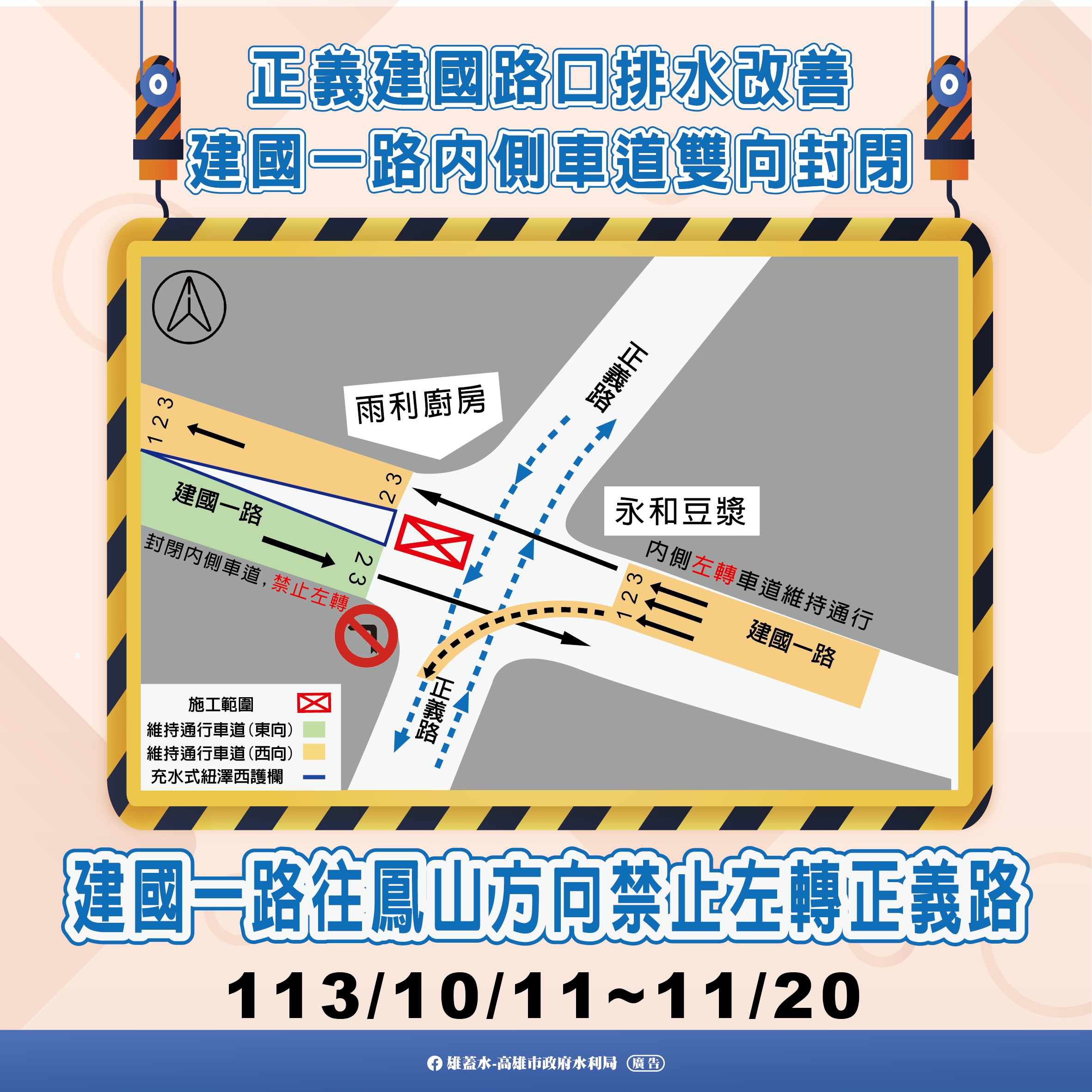 【記者謝富益/高雄報導】高雄市政府水利局辦理正義路建國一路口排水改善第一階段已完成,自113年10月11日至11月20日進行第二階段施工,施工期間封閉建國一路雙向內線各1個車道,且建國一路西向東鳳山方向的車輛禁止左轉正義路,請用路人提前改道或改走光復路二段、中山西路再轉澄清路。