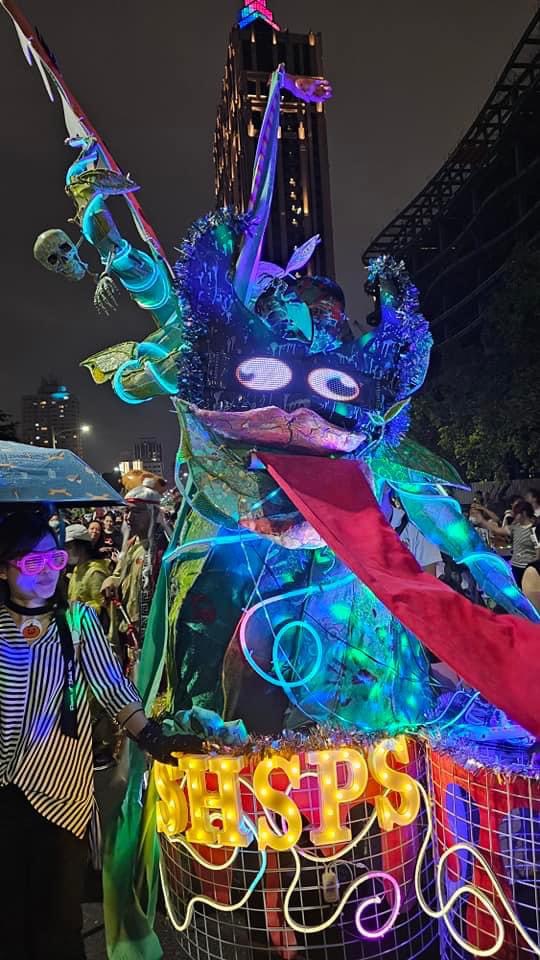 2024高雄萬聖節系列活動昨天晚上遊行隊伍包含小公視、紅鼻子馬戲團及澳洲的Curious Legends劇團,由高雄兒童組成的小鬼隊及閃亮隊,高雄熊、蜜柑站長也參與其中。現場結合雷射燈光及投影轉換,吸引眾多市民帶著孩子一起欣賞。系列活動到11月3日。
