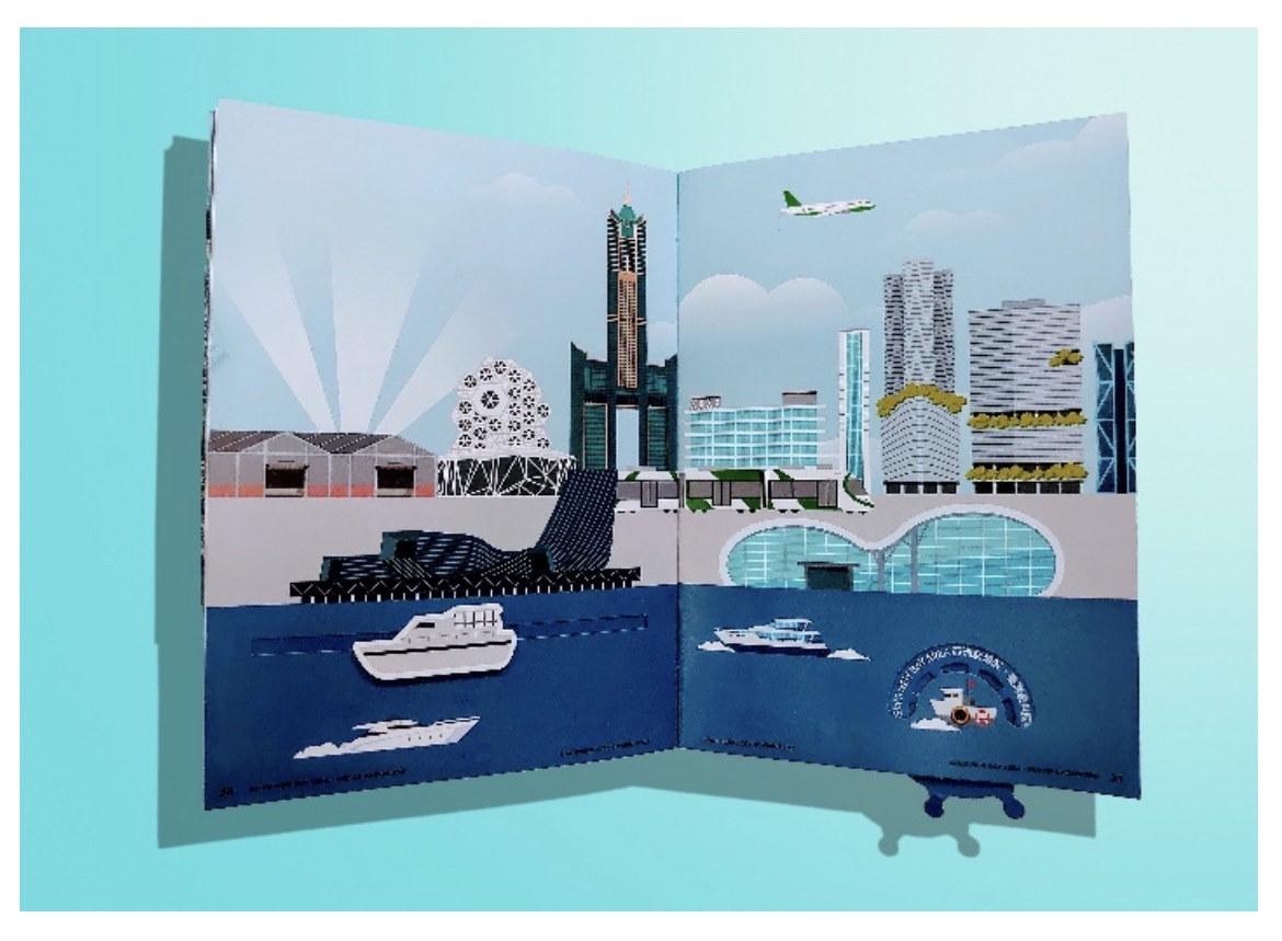都發局表示,亞灣城市紙雕及立體書,靈感來自近年同仁公務參訪港灣城市雪梨及新加坡時常見許多各式景點紀念品,設想以城市剪影為主軸,結合高雄海港城市特色,搭配水岸前中後線地標建築等,立體化呈現都市天際線及遠方山景。以POP-UP躍昇為概念,傳達高雄蛻變為國際商港的歷程,展現亞灣2.0 及5G AIoT智慧科技新聚落、亞灣社宅以及棧庫群轉型活化等未來發展藍圖。