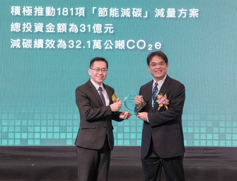 經濟部產業發展署楊志清署長(左)頒發「113年度產業溫室氣體自願減量績優廠商」,由中鋼環境保護處吳一民處長(右)代表公司受獎。(中鋼提供)