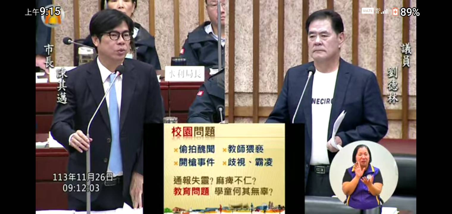 劉德林議員總質詢針對近期偷拍、教師猥褻、開槍事件、歧視霸凌等校園問題,質疑教育局行政體系通報失靈、麻木不仁。(記者翻攝)