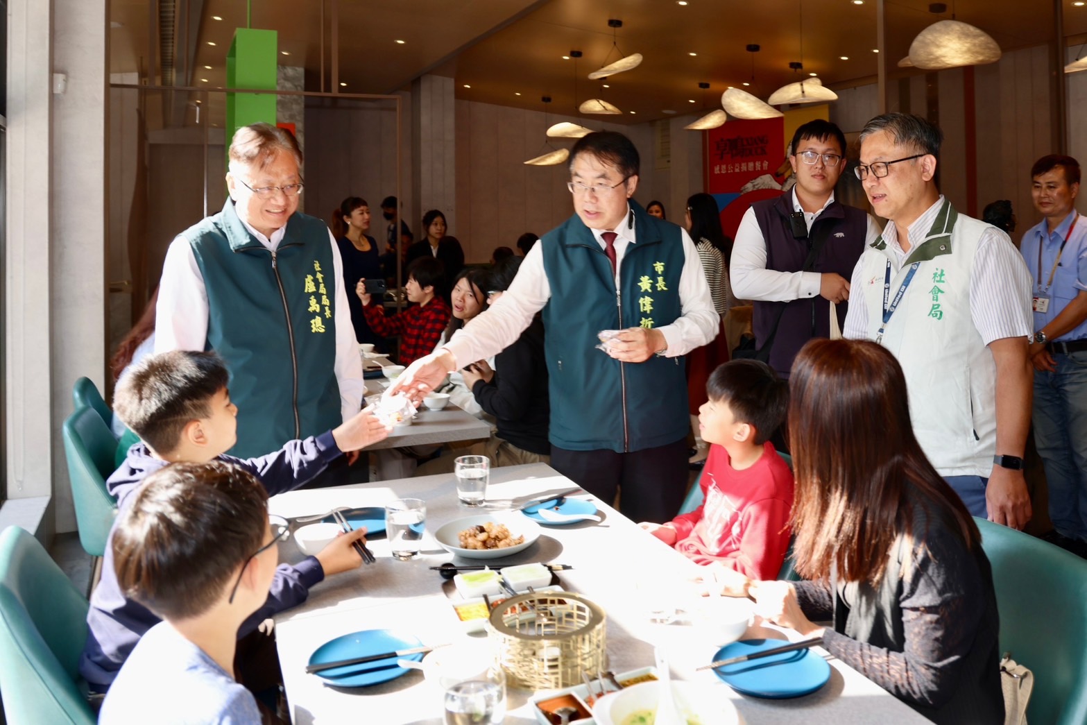 黃偉哲除了與弱勢兒少家庭共嚐享鴨美食,還現場發送小禮物祝福學童們學業進步,場面十分溫馨。