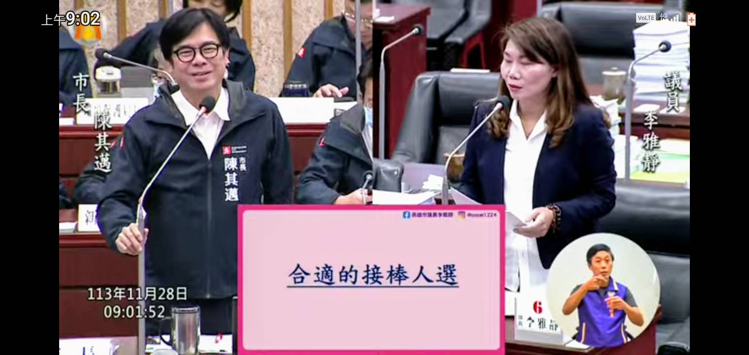 【記者蘇武智/高雄報導】高雄市議會今(28日)進行市政總質詢,市議員李雅靜提問市長陳其邁,2年後的接棒人選,需要具備什麼樣的條件?對此,陳其邁笑回,像李雅靜議員這麼優秀的都適合參選,但最後還是由市民決定,李雅靜追問未來如果她參選,陳其邁願意出面助選嗎,陳其邁一臉尷尬回應,有困難,除非李加入民進黨獲得提名。李雅靜話鋒一轉指出,未來的市長須具備,接地氣的卓越領導與溝通能力、全面的城市治理專業能力、以高雄特色為核心的願景規劃、關心基層需求與弱勢群體。她表示,綜合以上條件,柯志恩絕對具備這些條件,能夠完全無縫接軌的延續市政。
