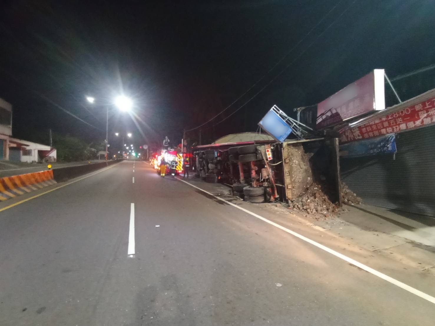 警方指出,今(1)日凌晨3時許,30歲李姓男子駕駛營貨曳引車沿旗南二路由南往北行駛外車道,至肇事地點欲臨停下車購物,欲停妥車輛時,疑行駛路面之排水溝蓋承受不住車身重量而斷裂,導致車輛右後輪陷入水溝,因此重心不穩故車體往右側翻覆,所載運土方物品滑落造成一旁的鐵皮屋受損而肇事,未造成其他人員傷亡。