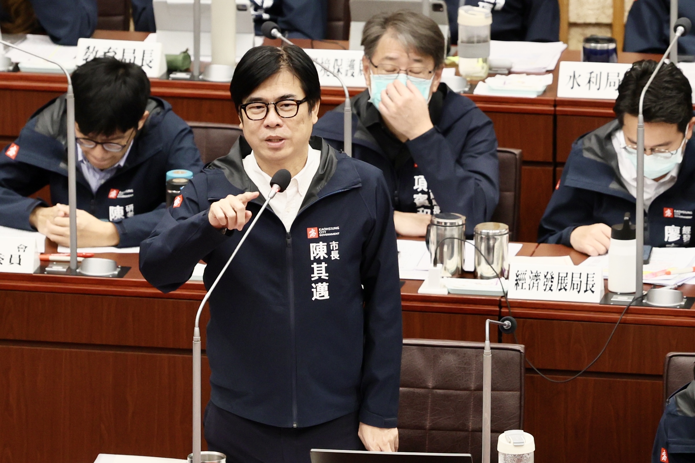 高雄市長陳其邁於市政總質詢答覆議員有關高鐵南延暨火車站周邊發展、茄萣大排閘門抽水站設置、北高雄台39線道路開闢及未來施政重點等相關議題。(高雄市政府提供)