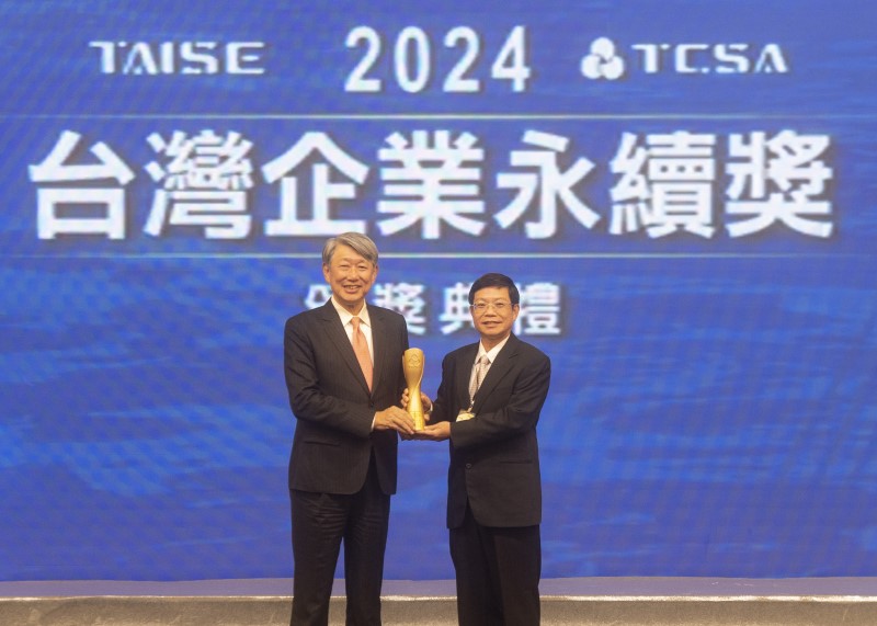 中鋼第八度榮獲台灣企業永續獎最高榮譽之「台灣十大永續典範企業獎」,由陳守道總經理(右)接受經濟部郭智輝部長(左)頒獎。(中鋼提供)