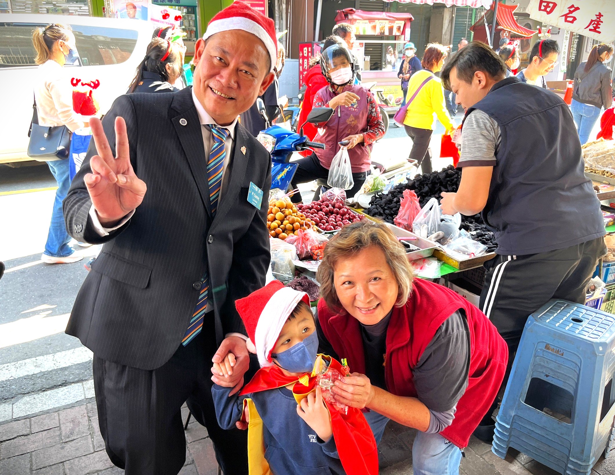 旗山早療中心邀請旗山東區扶輪社友和慢飛天使一起走入旗山老街報佳音,向社區民眾發送糖果餅乾。 (劉昱彣攝)