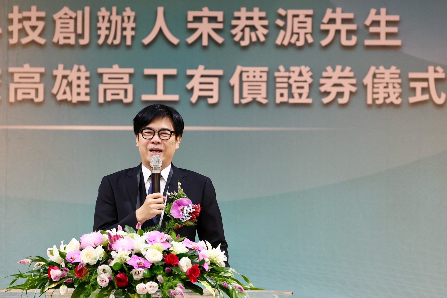 光寶科技創辦人宋恭源先生捐贈母校高雄高工有價證券,陳其邁出席感謝宋創辦人對技職教育的重視,並談到光寶科技近年也響應市府產業轉型政策,在楠梓科技產業園區加碼投資建廠,為高雄創造更多就業機會。(記者翻攝)