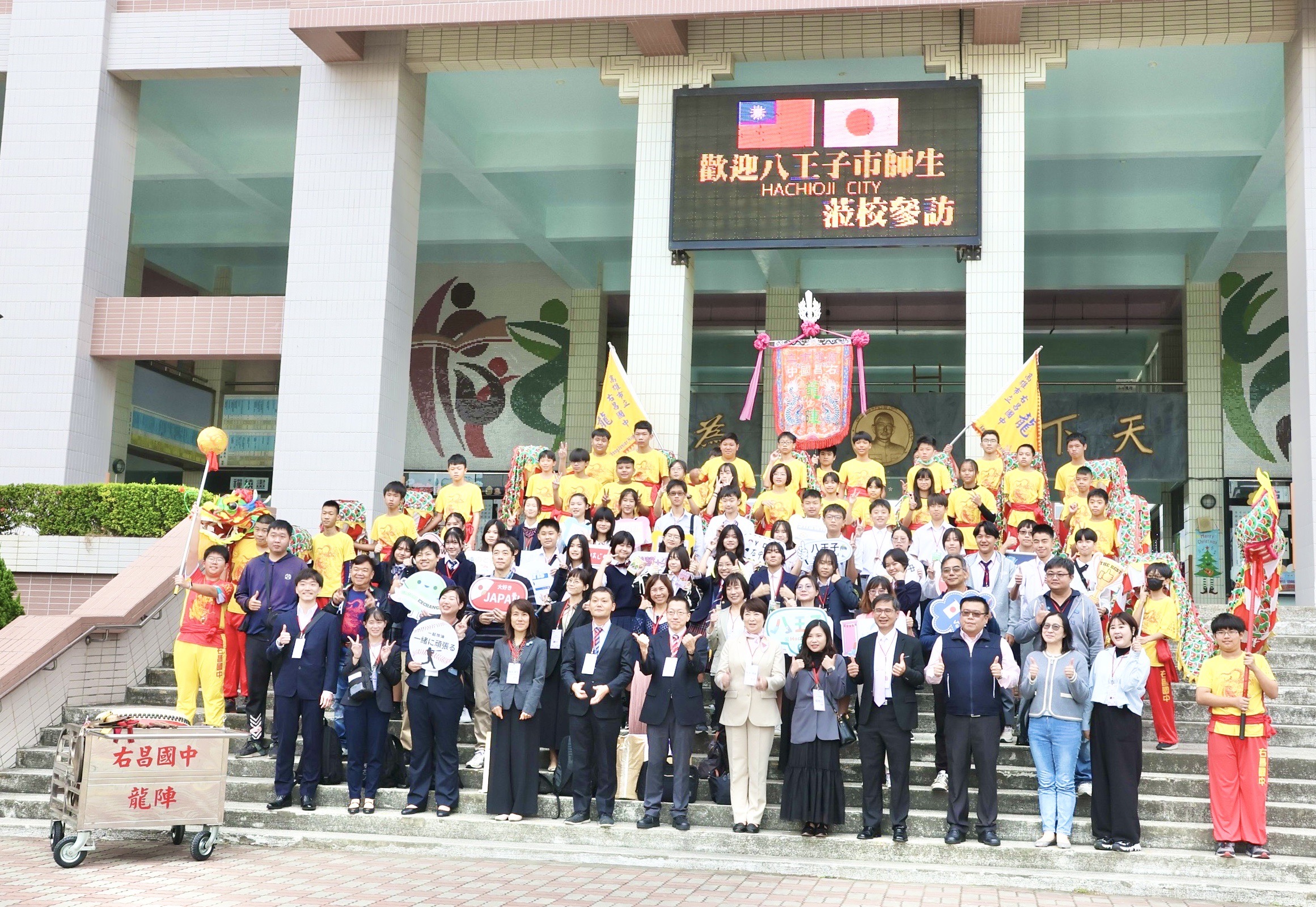 今年日本東京都八王子市由教育委員會生涯學習與體育部長平本博美率領16名國中生至右昌國中交流。上午開幕式由右昌國中「龍陣社」祥龍表演揭開序幕,並安排八王子市學生親自參與試舉龍隻,讓八王子市代表團感受高雄的熱情及與文化魅力。隨後,臺日學生共同參加表演藝術實作與英語短劇互動課程,透過戲劇探討反霸凌議題,深化文化交流的意義,也體驗傷妝化妝,在右昌國中學伴們的陪同,大家玩得不亦樂乎。