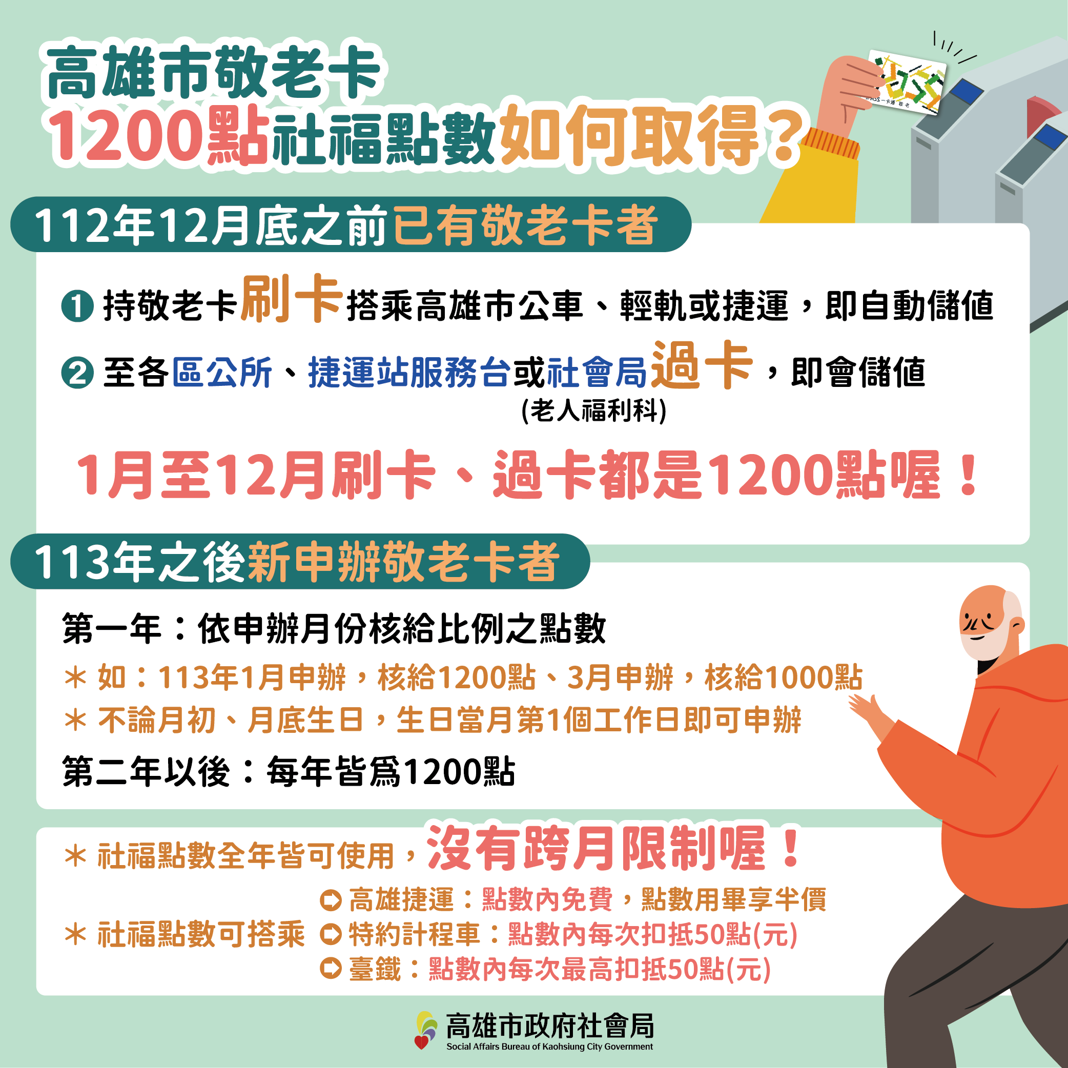 社會局表示,為鼓勵長輩外出社會參與,高雄市敬老卡自113年1月1日起,除維持免費搭乘高雄市公車、渡輪(不含觀光路線)及輕軌外,另加碼每年1200點社福點數,可用於搭乘高雄捷運、特約計程車及臺鐵。社福點數於12月31日如仍有餘額並不會累計至隔年,每一年重新給予1200點。