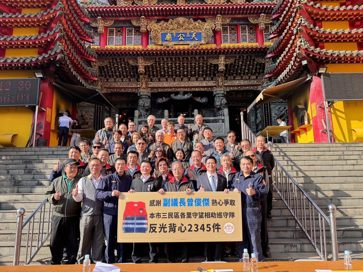 在議會經常爭取巡守隊員權益的曾副議長說,三民區86個里的守望相助巡守隊,為地方犧牲休息時間,日夜投入人力,大家要一起維護他們的執勤安全,夜晚執勤的反光背心早就破損老舊,極需汰換,熱心公益的玉皇宮主委一次捐贈2345件,令人感動。