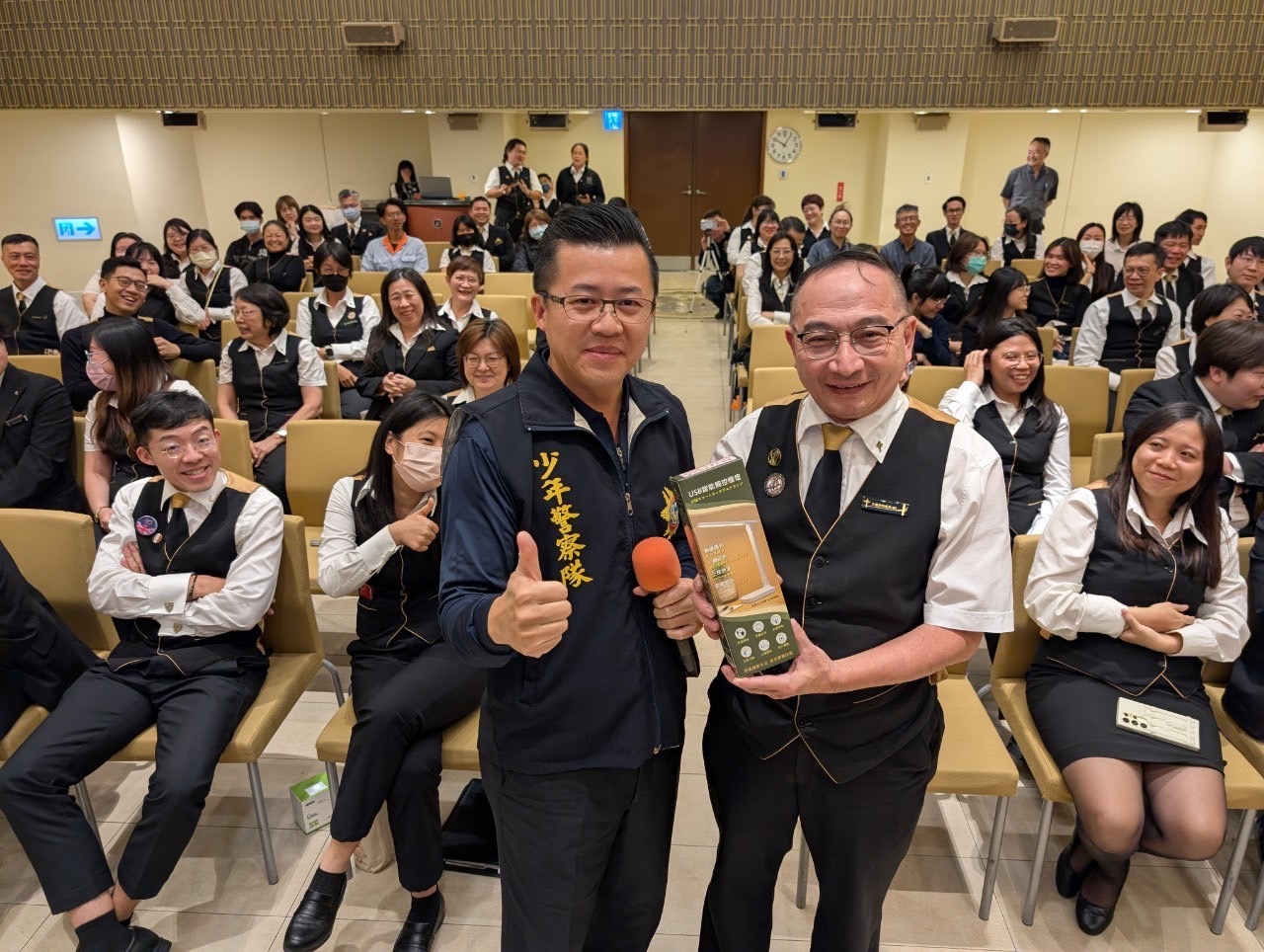 少年警察隊隊長陳仁正率宣導團隊向教會內數十位員工防範新型態詐欺。(高雄市政府警察局少年警察隊提供)
