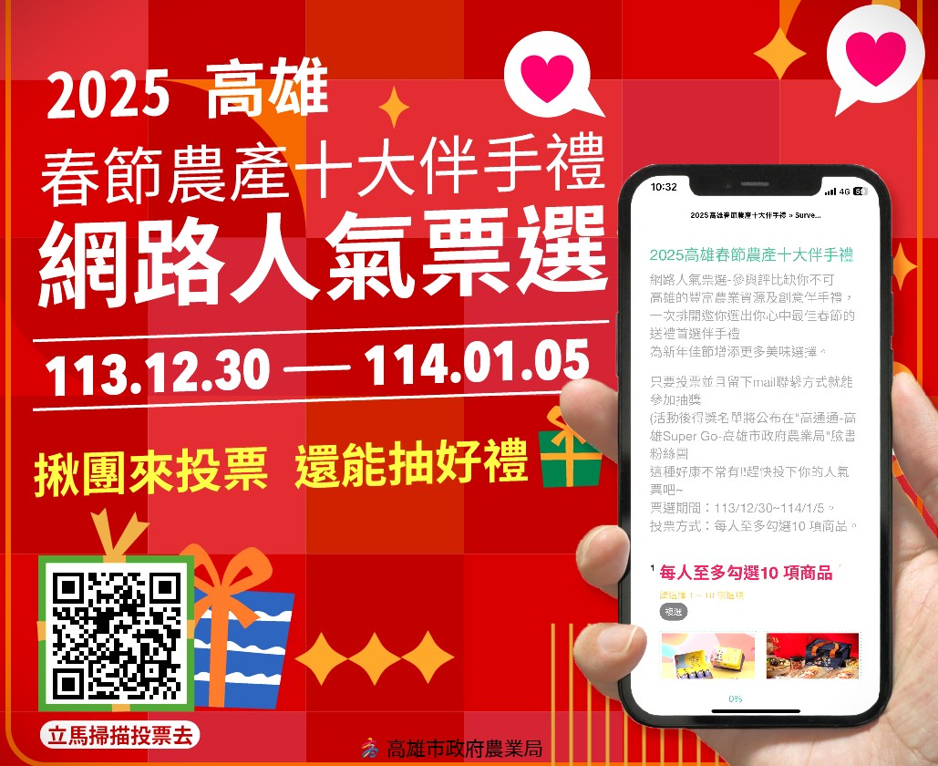 迎接春節,送禮就要送到心坎裡,來自高雄各地區好禮齊聚一堂,包括當季水果、生鮮魚肉、特色美食……包羅萬象,風味飲品、即食料理、休閒點心……應有盡有,由您欽點心中最佳春節伴手禮,參加投票還可以抽獎,每人可投10項,記得投好投滿。