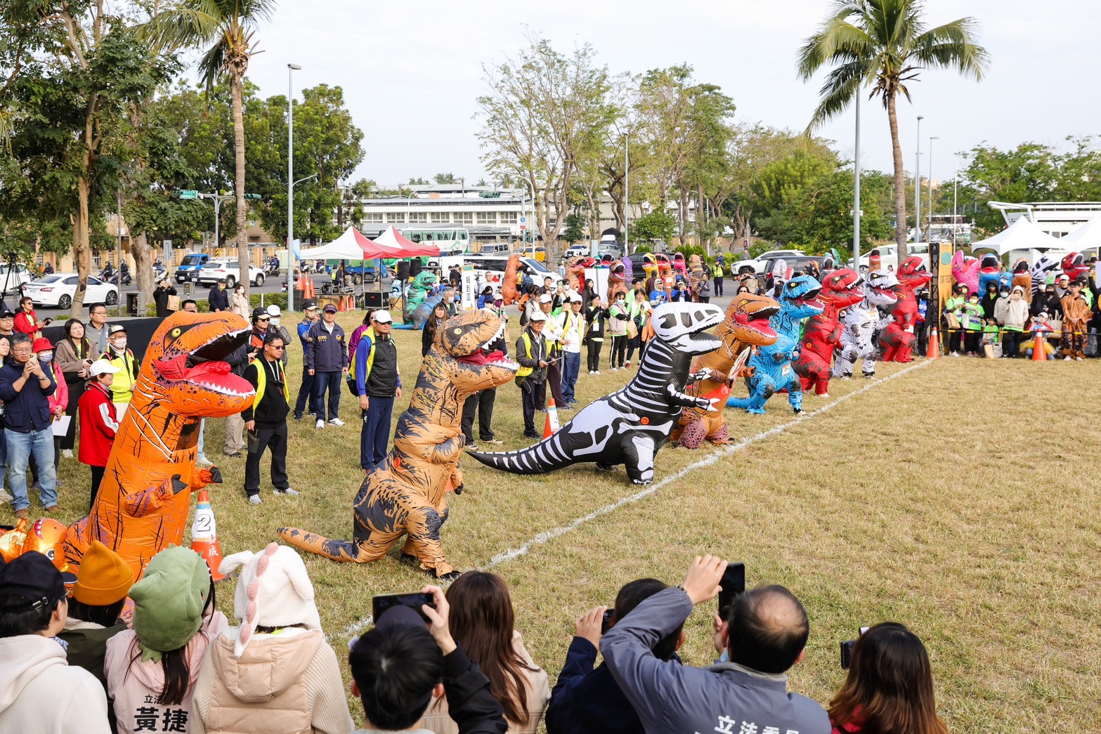 隨後市長陳其邁、立委許智傑也換上恐龍裝,一起參與最速恐龍爭霸賽,並和之前在大港造筏賽事中小贏他的「FRM台灣獼猴隊」再度一較高下,賽後陳其邁也笑稱,恐龍路跑真的很有趣,但平時一定要多運動才行,也邀請全台民眾到高雄觀光旅遊,除了有山海河港美麗景致外,更有許多有趣的活動及美食,感受城市魅力與冬日宜人天氣。