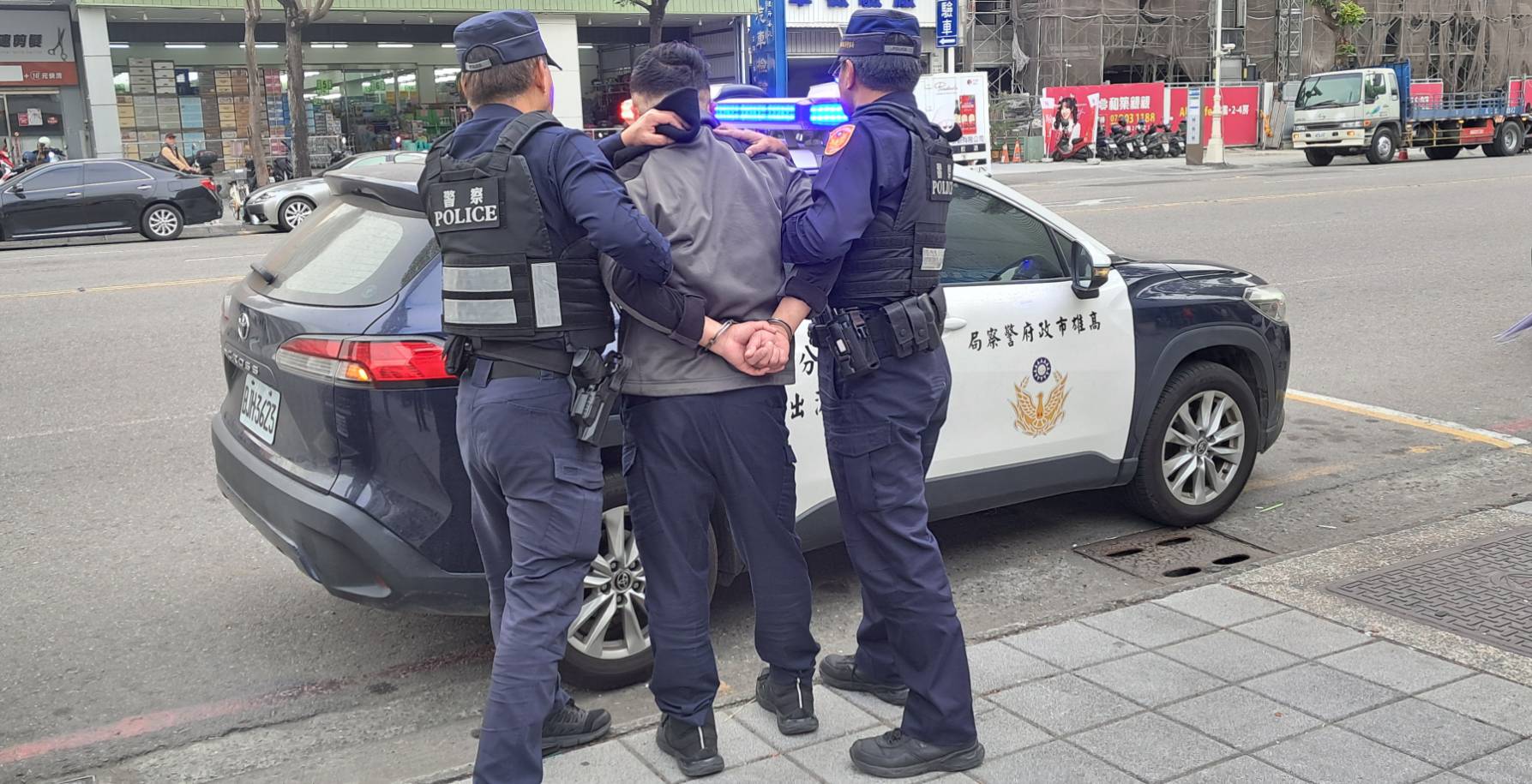 演練過程中,擔任搶嫌歹徒,持槍進入「台灣銀行小港分行」高喊搶劫,渠擬真動作,讓正在提款民眾也為之震撼。隨著,分局機動反應警力快速到場,歹徒也順利被壓制逮捕帶案偵辦,結束一場,讓民眾、行員及警方都提升防搶意識的擬真訓練。