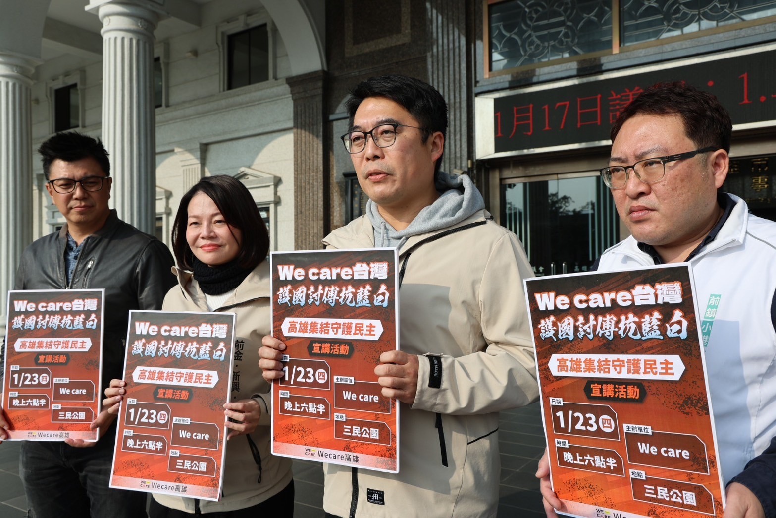 【記者李文賓/高雄報導】We care高雄將於1月23日(週四)晚間6點半在高雄三民公園舉辦「We care台灣 護國討傅抗藍白」宣講活動。今(17日),高雄市議會「南方聯合問政連線」成員簡煥宗、張勝富、邱俊憲、何權峰、黃彥毓、湯詠瑜及黃文志聯合發聲,呼籲市民踴躍參與。他們將深入各自選區動員支持者,以凝聚群眾力量,向藍白聯盟推動爭議修法與惡意刪減中央預算等行徑表達強烈抗議。