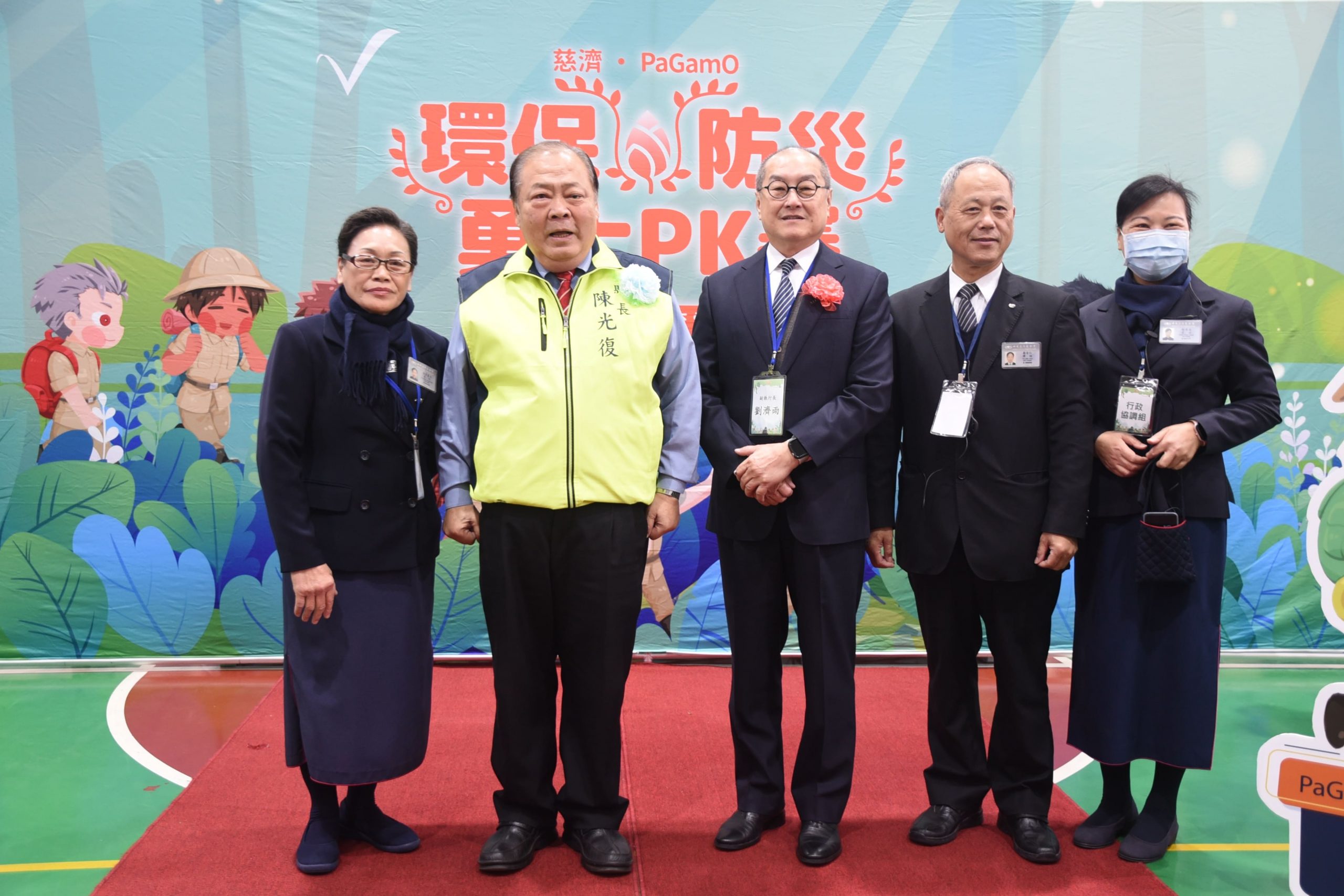 澎湖縣長陳光復(右二)出席慈濟與PaGamO幫你優公司跨界合作的「環保防災勇士電競PK賽暨嘉年華會」開幕式。(記者翻攝)