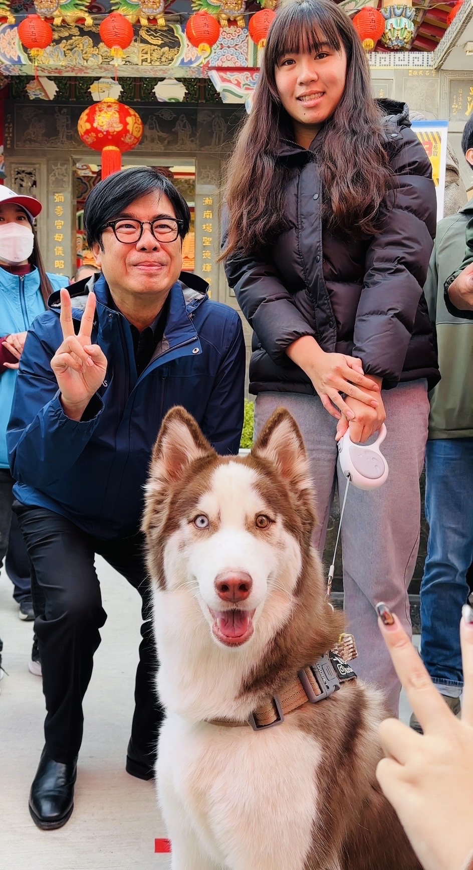 民眾熱情牽著家中最寶貝的寵物,在廟前廣場井然有序地排隊,開心地從市長手中接過「蛇來運轉」新年小紅包。(記者翻攝)