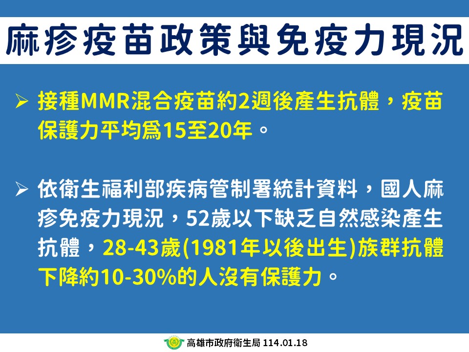 (記者洪添處高雄報導)高雄市昨(17)日出現首例麻疹境外移入確定病例,為50多歲本國籍女性,去(113)年12月25至29日曾至越南旅遊,12月29自小港機場入境並搭乘捷運返家,於今(114)年1月3日至4日至花蓮旅遊,個案於1月3日出現發燒、咳嗽症狀,1月4日出疹,自出現症狀後曾有2次就醫紀錄,於1月8日由醫院通報並收治負壓隔離病房至1月10日,個案出院後已無傳播風險,疫調可傳染期113年12月31日至114年1月8日,個案足跡曾涉及花蓮縣、臺東、屏東、高雄市等多處公共場所並搭乘大眾運輸工具(個案有佩戴口罩)。