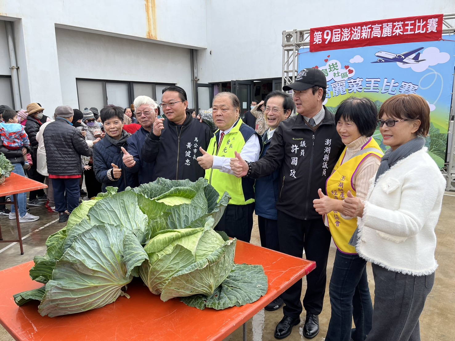 「第9屆澎湖新高麗菜王比賽」19日在烏崁社區活動中心登場,澎湖縣長陳光復到場替農友加油打氣,展現對在地農業的支持與重視。最後由葉興國以單顆最重19.1台斤奪下高麗菜王;單顆體積最大與最漂亮獎,則分別由李玉葉與葉朝順奪得。