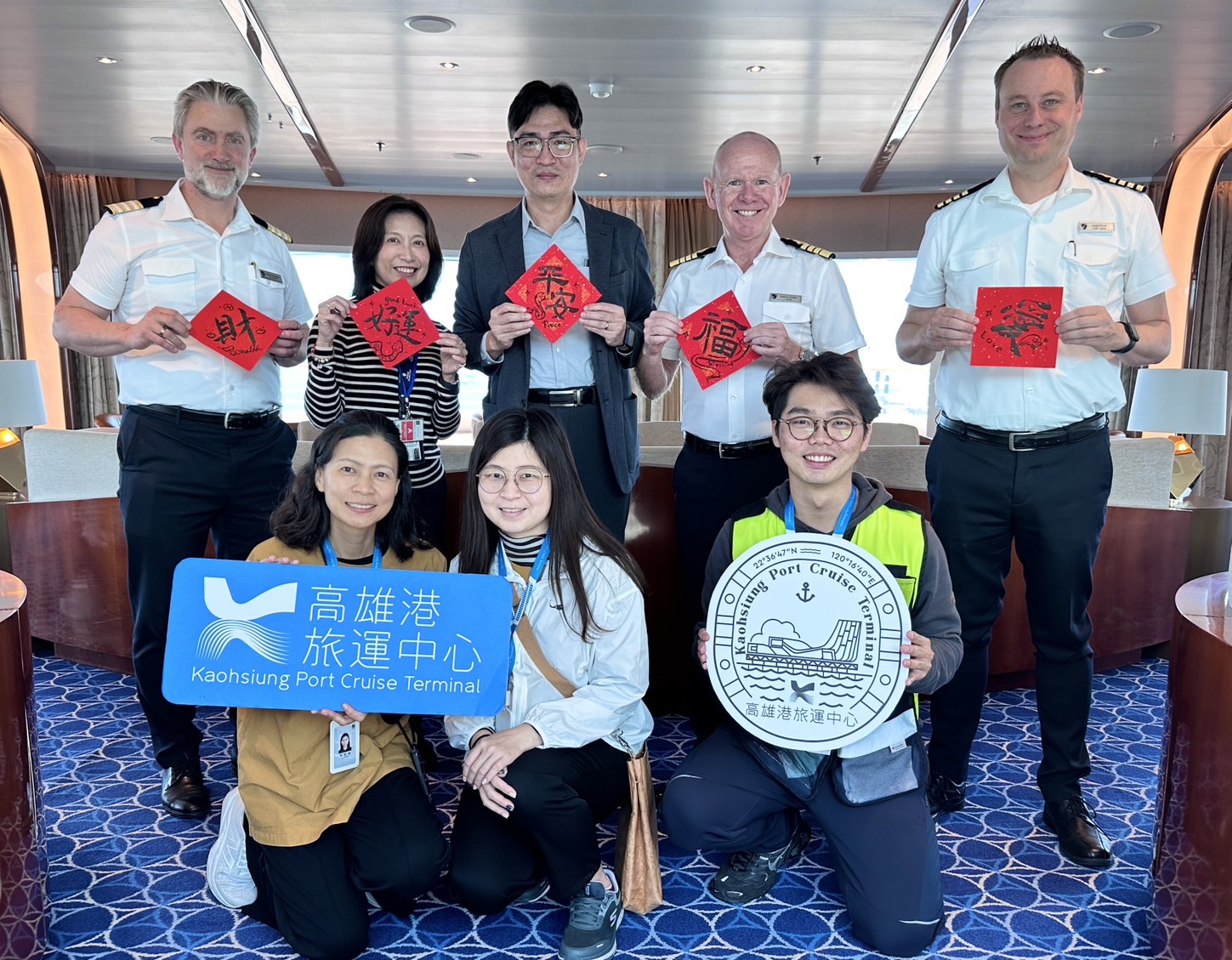 高雄港務分公司與高雄市政府海洋局攜手,以熱情的傳統原住民迎賓舞蹈歡迎首航郵輪旅客,同時特別安排春聯書法教學,由專業書法老師引導旅客親手書寫,讓國際旅客感受到濃厚的臺灣文化魅力,活動現場洋溢著熱鬧氣氛,帶給旅客深刻且難忘的美好回憶。