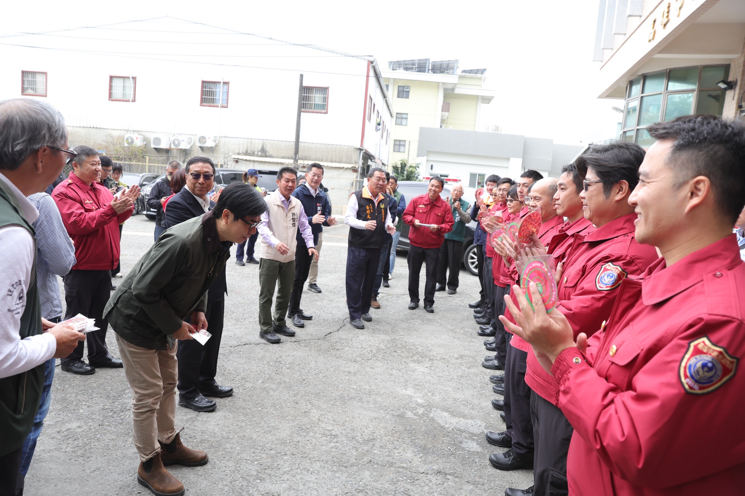 (記者李林韋呈高雄報導)春節初三年假期間,市長陳其邁、議長康裕成、立法委員許智傑、義消總隊長陳義永、義消第五大隊長黃明太共同慰問路竹消防分隊,市長陳其邁一一發送蛇年小紅包感謝第一線執勤消防人員犧牲家庭春節團聚時光,堅守崗位,守護市民安全。