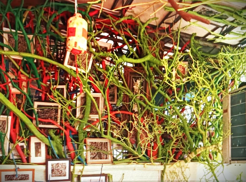 藝術空間前庭的外觀,以綠鬱森林的感覺,讓人有想要進去的渴望,環保濃密樹枝上色,再搭配點綴的花燈,在自動設定裝置的巧思下,每當夜晚時刻來臨,於黑暗中,那微弱光明的盞盞花燈,露出誘人注目的美妙景色,讓觀賞者進入屋內空間參觀欣賞作品時,能賞心悅目舒適得宜,陶冶品格,培養心性,不虛此行,而有所收穫、有所感覺、有所共鳴。