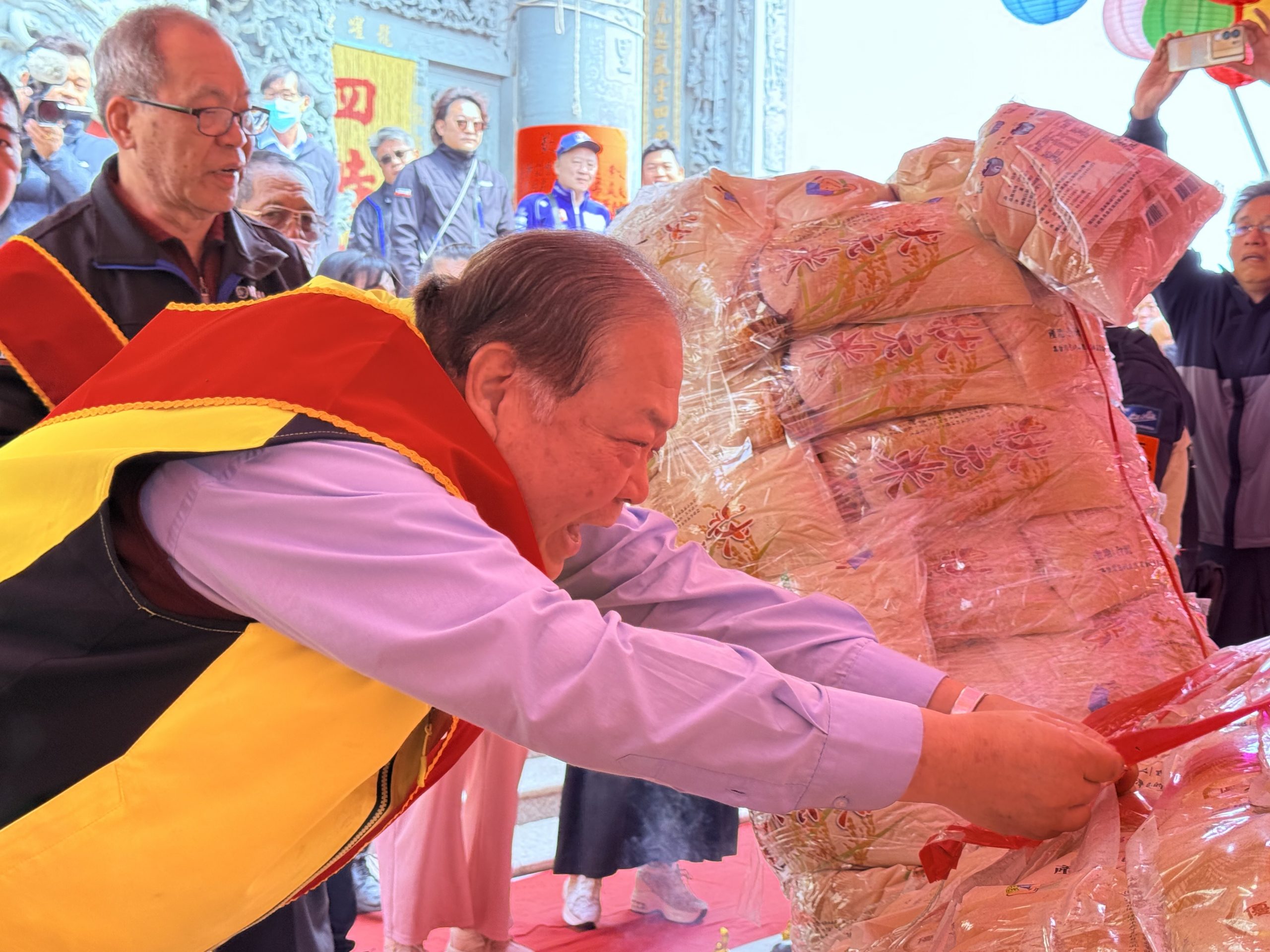 【記者黃建華/綜合報導】澎湖縣長陳光復今(25)日中午來到龍門觀音宮,與緯鴻車業有限公司董事長呂瑞進、議員、廟方代表以及地方人士等,共同參與祈福大米龜拆解儀式,並將平安米分送給弱勢團體,傳遞溫暖與祝福。