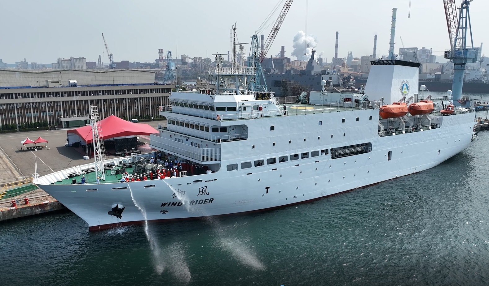 【記者蘇品軒/高雄報導】由國立高雄科技大學負責執行的教育部新造實習船「御風輪」,今(26日)自台灣造船國際股份有限公司碼頭離岸,由高雄港出發首航日本東京,高科大輪機系、航技系師生登輪成為首批訓練師生,預計3月3日抵達日本東京有明碼頭。御風輪將取代育英二號成為教育部第三代的海事訓練船,全新打造的御風實習船將為我國海事人才教育開啟新的篇章,教育部長鄭英耀親自前往台船出席交船暨首航儀式,並且祝福御風輪首航登船師生航程順利。
