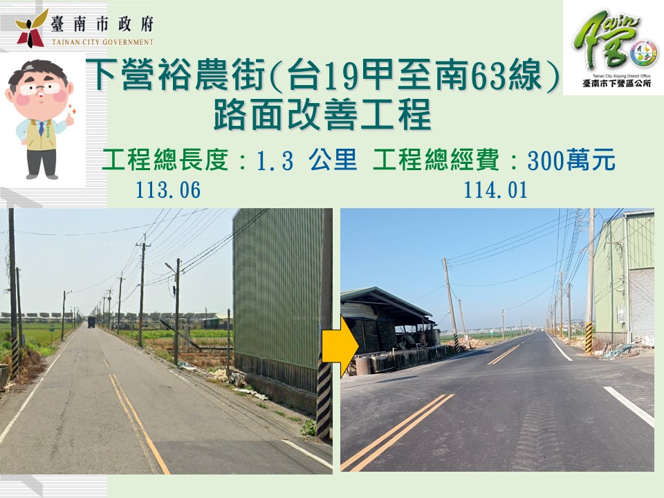 下營區裕農街為東西向重要聯絡道路,串聯臺19甲線與南63線,往來中營、六甲及官田地區,對地方交通具有關鍵作用。因路面多處補丁影響行車品質,下營區公所於113年6月提案市府爭取經費,由工務局辦理改善,並於114年1月完工。此次修繕範圍自臺19甲線至南63線,全長約1300公尺,除重新鋪平道路外,也同步繪製道路邊線與分向線,使道路更為順暢,顯著提升行車舒適度與安全性。區長李宗翰表示,除裕農街外,市府亦持續推動中山路一、二段及南58線的路平專案,未來下營區道路品質將更加優質。