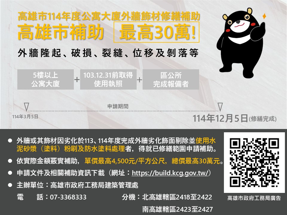 【記者葛志琪/高雄報導】高市府工務局今(114)年延續辧理「公寓大廈外牆飾材修繕補助」,每件每平方公尺最高補助金額4,500元且最高不超過30萬元限。受理期間為3月5日至12月5日止,只要在受理截止日前修繕完成並向工務局提出申請就可獲得補助,歡迎符合資格的大樓管委會或管理負責人把握機會踴躍申請。