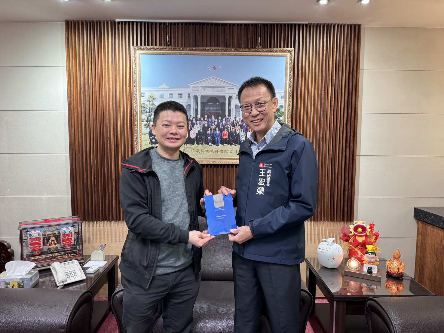 副秘書長王宏榮、毒防局長陳盈秀、農業局長姚志旺、青年局長林楷軒及正推動組織整併的研考會主委陳博洲,昨(19)日赴議會與副議長進行市政相關業務交流;王宏榮到任尚未滿月就滿面滄桑,曾副議長見狀立即送上一盒面膜,並笑著要他好好「保養」。