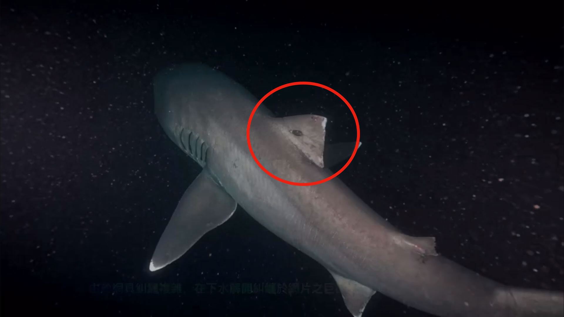 海保署透過在軟骨魚類身上裝設衛星標識器後,可精確記錄魚種在水底各項數據。(紅線框內為巨口鯊標識器。翻攝海洋保育署)