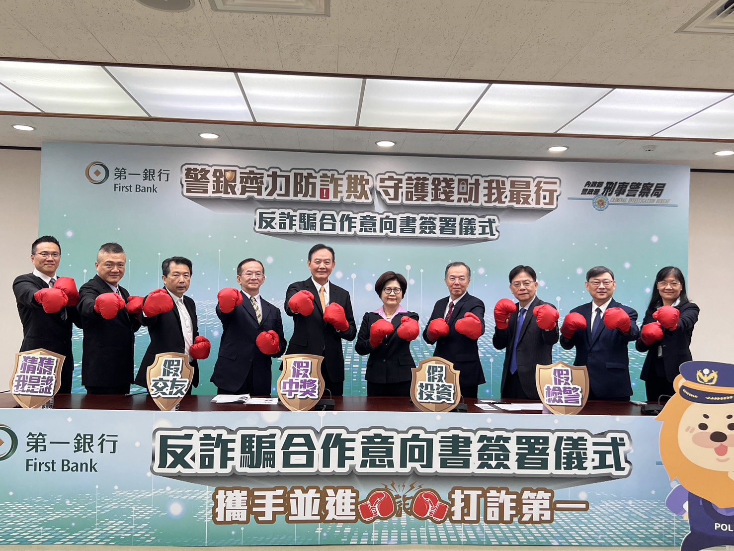 警銀齊力防詐欺,為全面阻詐斷絕詐團銀根,刑事警察局長周幼偉(左3)與第一銀行董事長邱月琴(右2),簽署防詐合作備忘錄。(翻攝刑事警察局)