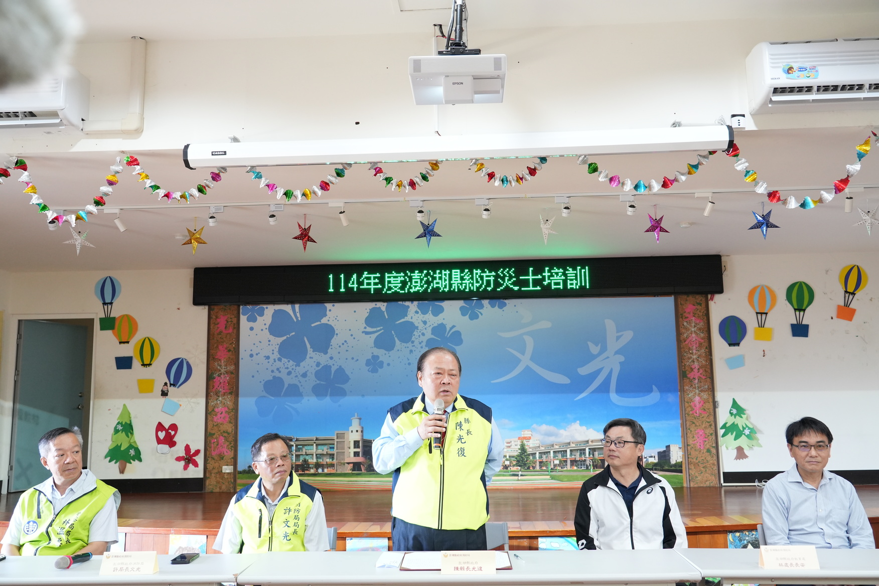 澎湖縣長陳光復親臨主持開訓典禮,與消防局長許文光、警察局長林温柔、教育處長林長安、文光國小校長洪宏賢一同出席,表達對本次培訓的重視。他勉勵學員認真投入課程,未來在實際防災工作中發揮所長,為社區安全盡一份心力。
