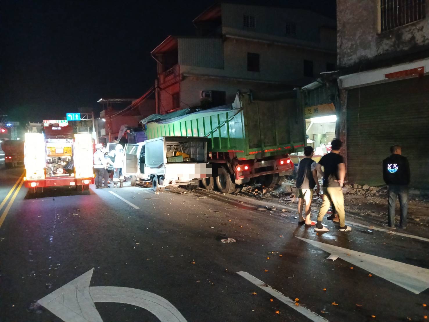 欲左轉小貨車與直行砂石車發生碰撞,後續造成砂石車衝撞3間民宅。(記者翻攝)