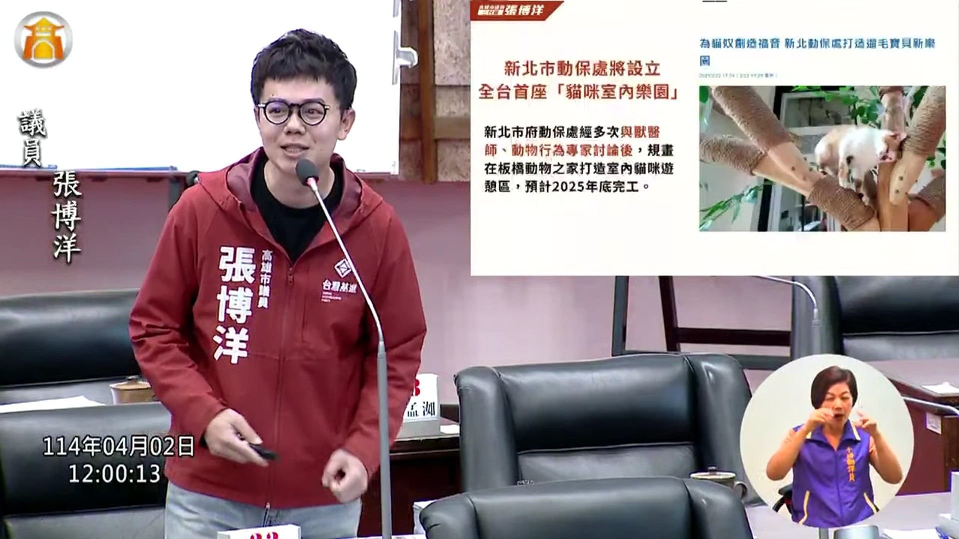 張博洋表示在此情況下,市政府應該重新思考,為高雄市的貓咪規劃一個專屬的活動空間,並引進更多創新的設施。張博洋以新北市動保處目前正在打造全台首座「貓咪室內樂園」為例,該樂園不僅提供貓咪自由探索的空間,還規劃了人貓共住示範區,讓飼主可以學習與貓咪相處的技巧。此外,更利用AI管理技術,確保只有同戶貓咪能同時進入,並結合寵物晶片認證及疫苗注射。高雄也可以參考這樣的模式,為本地的貓咪和飼主提供更完善的生活環境。