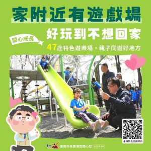 黃市長說為滿足不同年齡兒童之遊戲需求,全市也建置47座特色遊樂場,提供具創意與挑戰性的遊戲設施,如極限滑梯、高空攀爬架、共融式鞦韆等,讓孩子在遊戲中發展體能與社交能力,讓這些特色遊樂場 打造創意童年。黃市長強調這些遊樂場融入當地特色,並考量無障礙設計,確保每位兒童都能享受安全、優質的遊戲體驗。