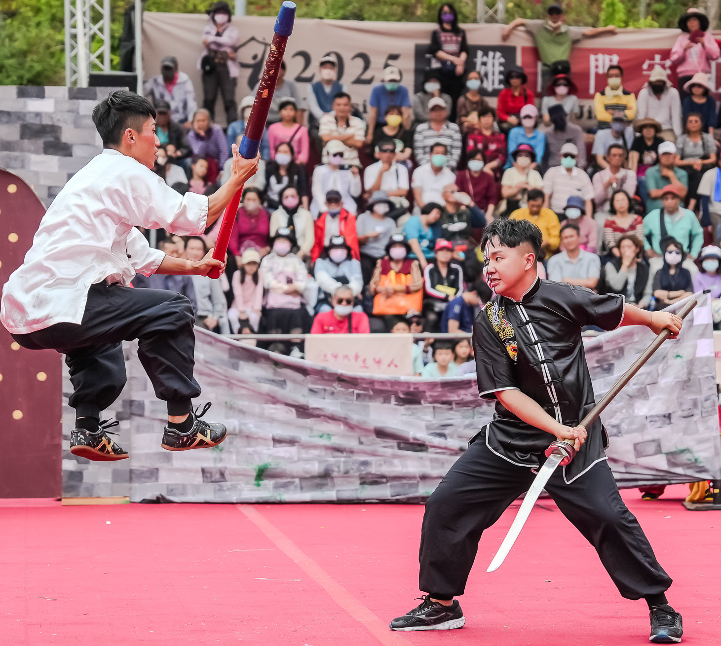 決賽現場高潮迭起,民眾歡呼聲連連,各隊使出渾身解數,以創意編排、華麗服裝與吸睛妝容,加上撼動人心的武打招式,讓觀眾拍案叫絕。打頭陣的「關廟東勢旺萊寶貝」由祖輩長者組成的「千歲團」演出,將在地竹編化為兵器,呈現八卦陣、蜈蚣陣等經典陣法,贏得滿堂彩。「民靖宋江」傳承客家武陣與打獅文化,以阿弟牯的時空穿越故事串連黃蜂結巢、龍捲水等陣法,趣味十足。「加樂傳藝」結合廟埕、霹靂舞、三節棍與拳術,詮釋不同文化從衝突走向團結的演變。