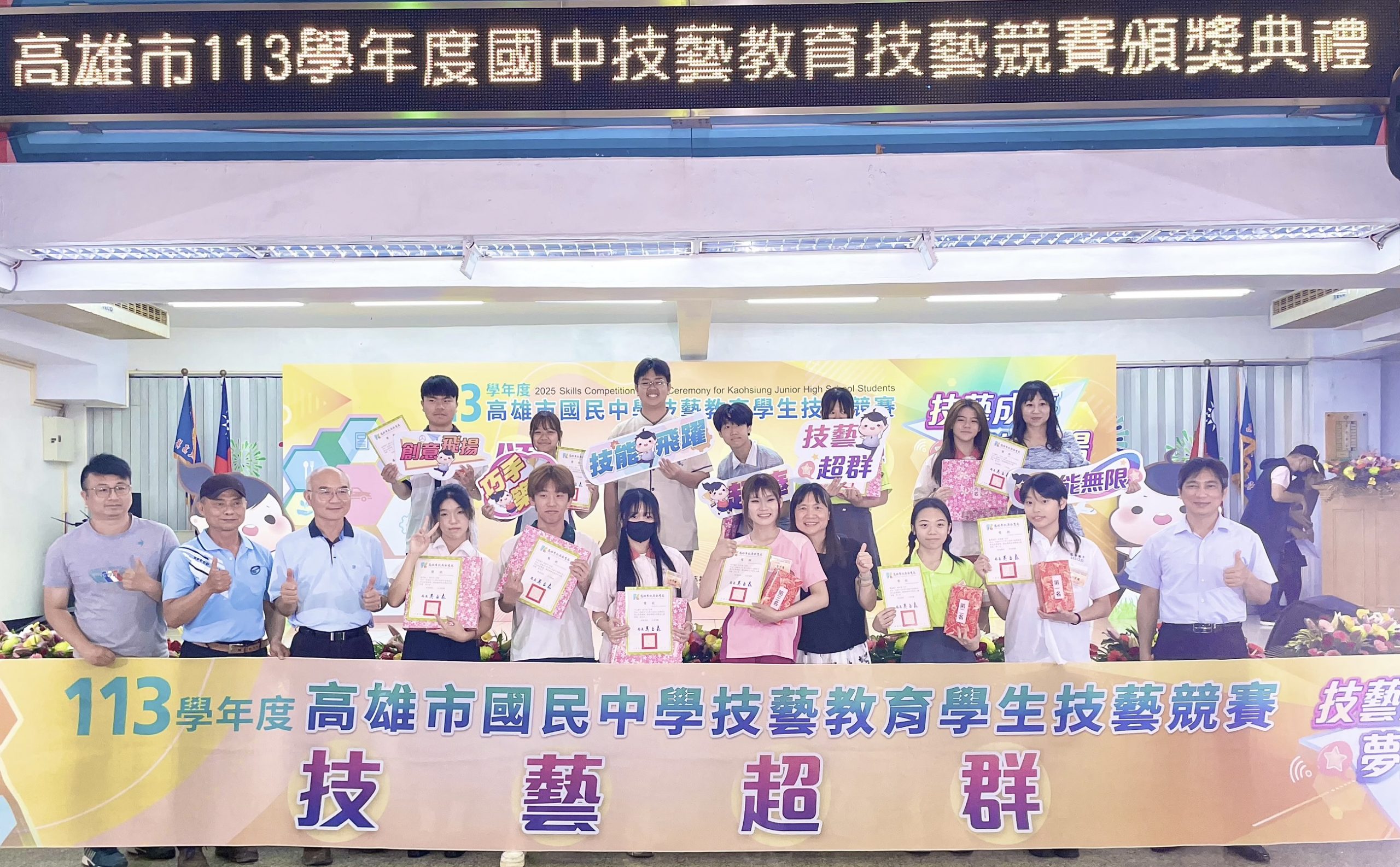 高雄市113學年度國民中學技藝教育學生技藝競賽共計辦理12職群、23個組別,經過114年1月21日至23日的學科與術科考驗後,於今(11)日下午1時於高英工商舉行頒獎典禮,共計174位得獎同學;獲獎學生將可參加「114學年度高雄區國民中學技藝技能優良學生甄審入學高級中等學校專業群科」並獲得加分。