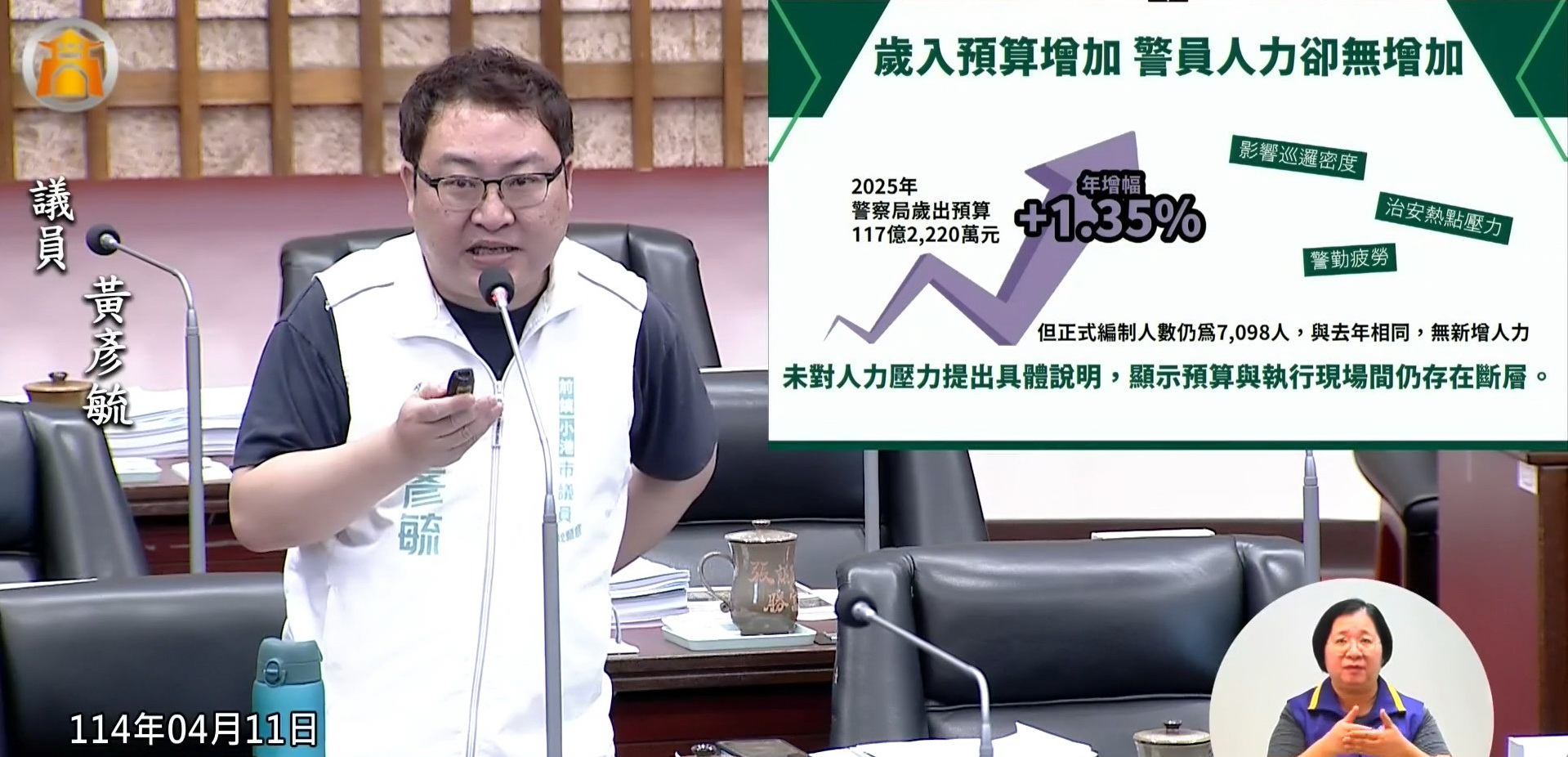 針對警察人力議題,黃彥毓指出,高雄市113年警察局歲出預算已增至117億元,但正式編制警力仍為7098人,與去年相同。他表示,自1999話務中心開通以來,警察局勤務量持續增加,但人力未見成長,許多偏遠地區如六龜、美濃見警率低,警力壓力未獲舒緩。