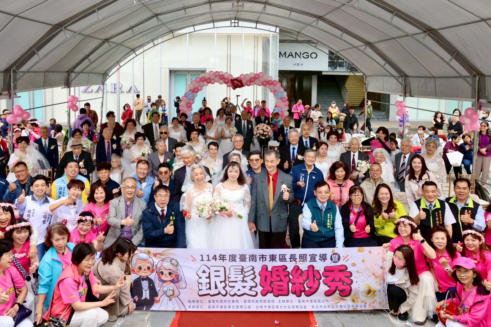 許多長者過去因時代背景、經濟條件或其他因素,未能擁有一場正式的婚紗攝影或婚禮。為了重溫人生幸福時光,臺南市東區區公所今(13)日上午在南紡時代公園舉辦「長照宣導暨銀髮婚紗秀」,讓年滿七十歲的銀髮夫妻穿上美麗的婚紗與西裝,感謝人生伴侶一生的付出與扶持。臺南市長黃偉哲特別到場獻上祝福,與盛裝打扮的銀髮夫妻們開心合影留念,立委陳亭妃也到場共襄盛舉。