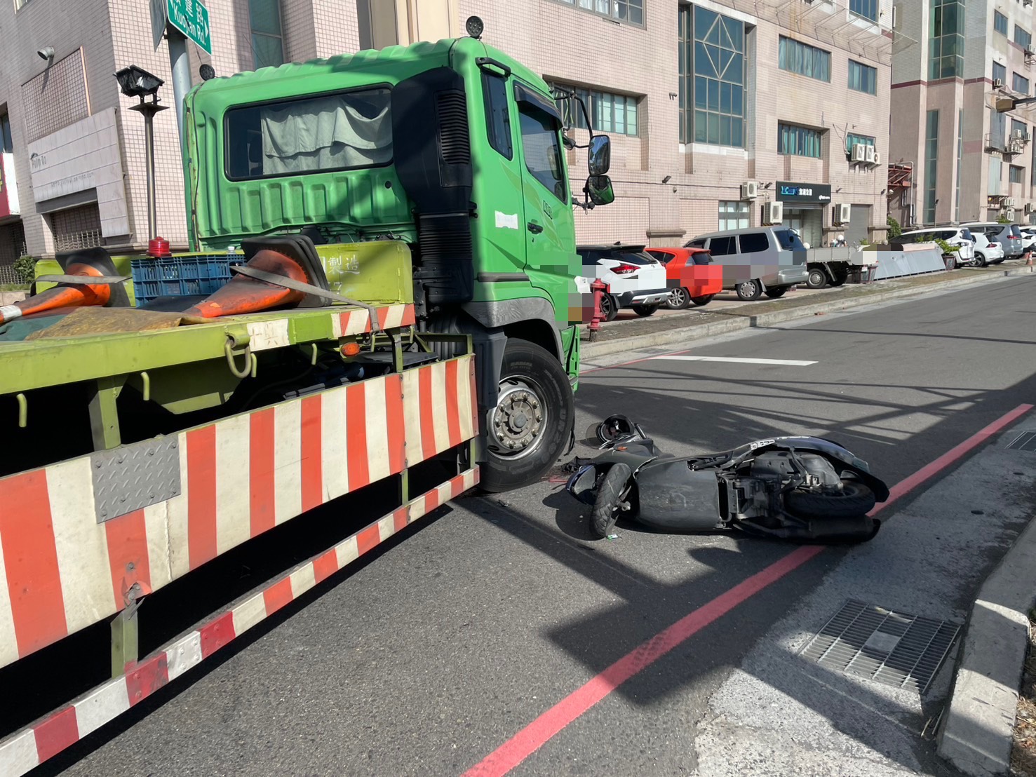 高雄前鎮擴建路與國華一街口,聯結車右轉時與直行機車發生碰撞,機車倒地、騎士傷勢不輕,所幸送醫後無生命危險。(圖:翻攝自前鎮分局)