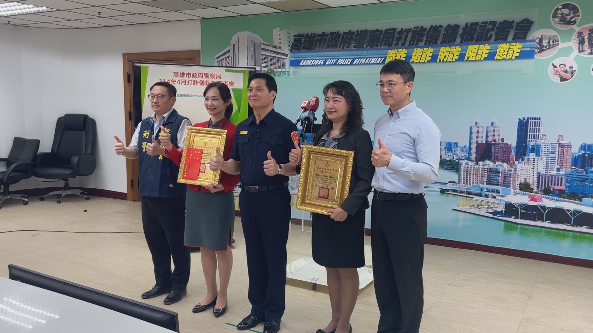 高市府警察局「打詐儀錶板」記者會上,表揚中國信託銀行高雄地區分行,成功攔阻多起詐騙案件,單月攔阻金額就超過三億元。(記者李佳龍/攝)